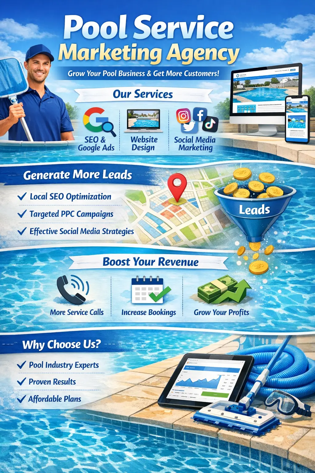 Pool Profits is the leader in pool service marketing. With over a 94% success rate since 2012, our campaigns and tech stack are designed to help pool service companies scale their businesses throughout their local area and dominate online with expert level digital marketing and conversion rate optimization.