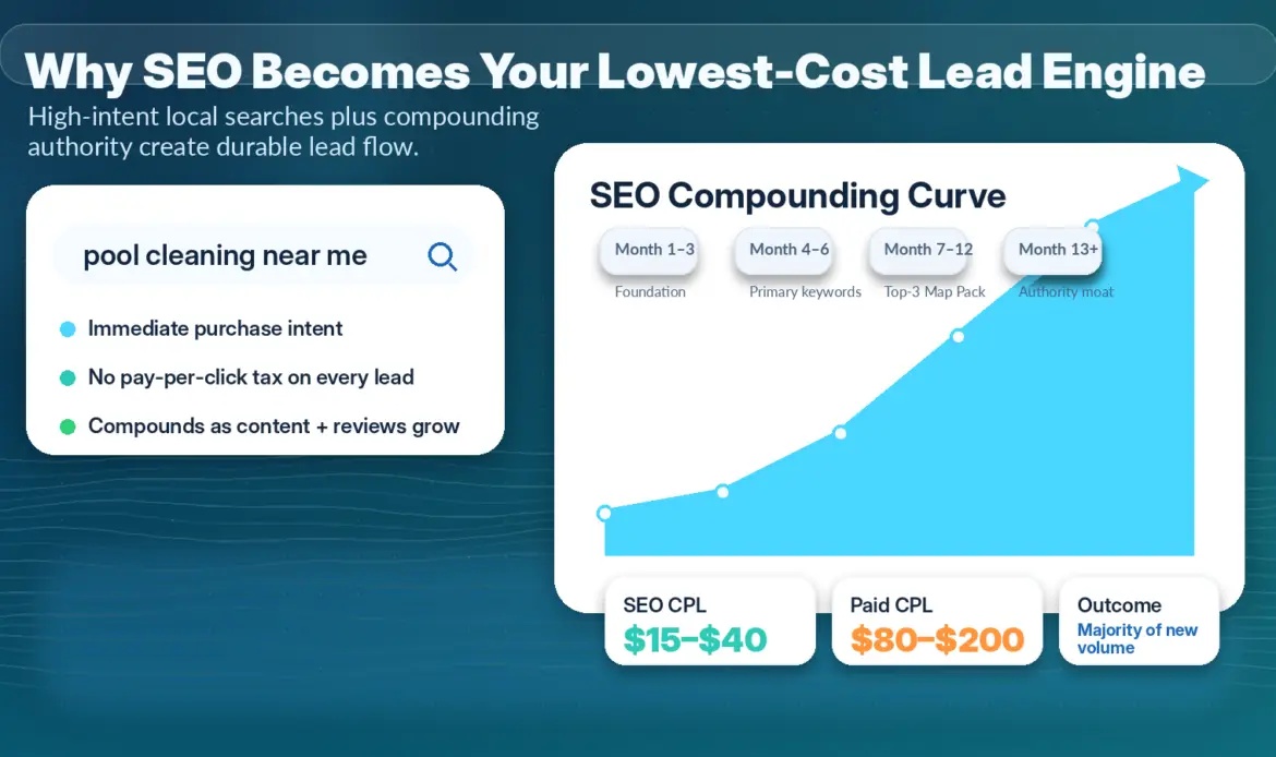 The compounding nature of SEO is what separates it from every other channel. The content you publish today, the citations you build this month, and the reviews you earn this year continue paying dividends for years. A pool company that invests consistently in SEO for 12 to 18 months typically reaches a position where organic traffic generates the majority of its new customer volume at a cost per lead of $15 to $40, compared to $80 to $200 per lead from paid channels. That economic gap widens every year as organic authority builds.