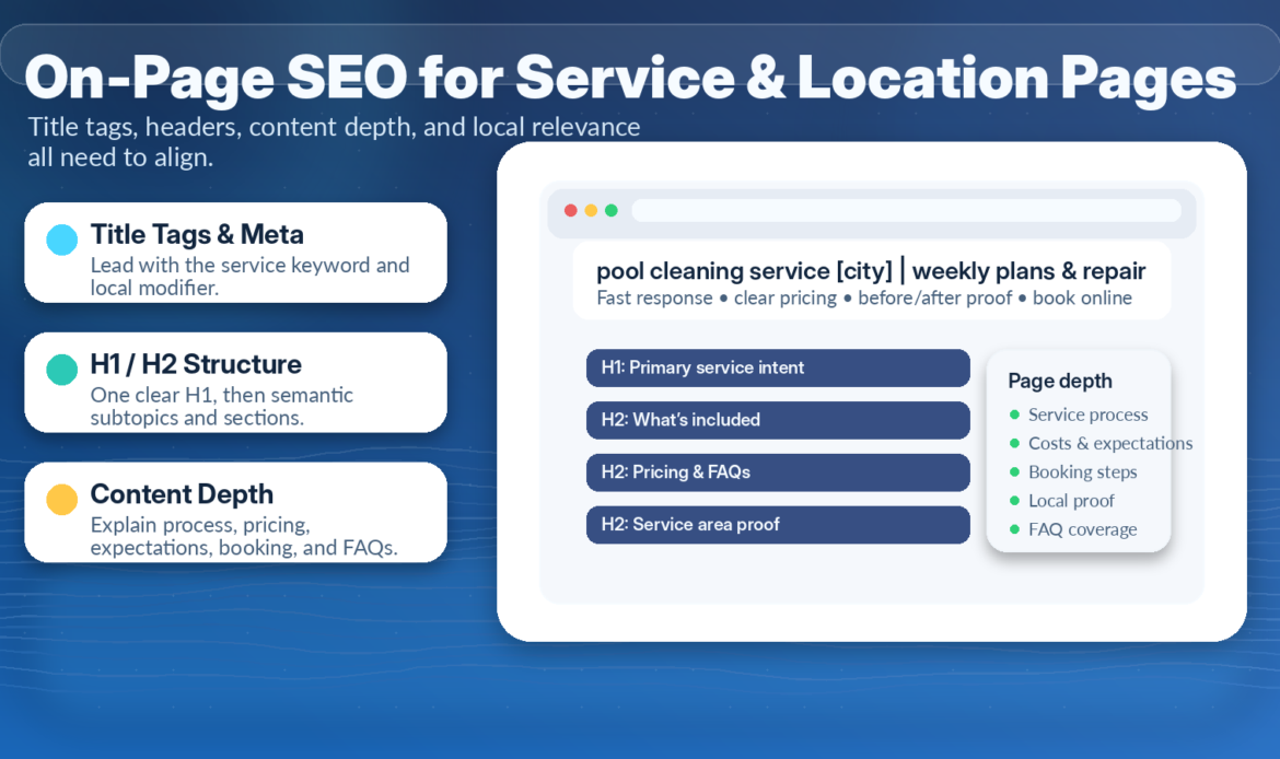 On-page SEO refers to the optimization of your individual website pages to rank for specific search terms. For pool companies, the most important on-page targets are your service pages and location pages — the pages that connect directly to purchase intent.