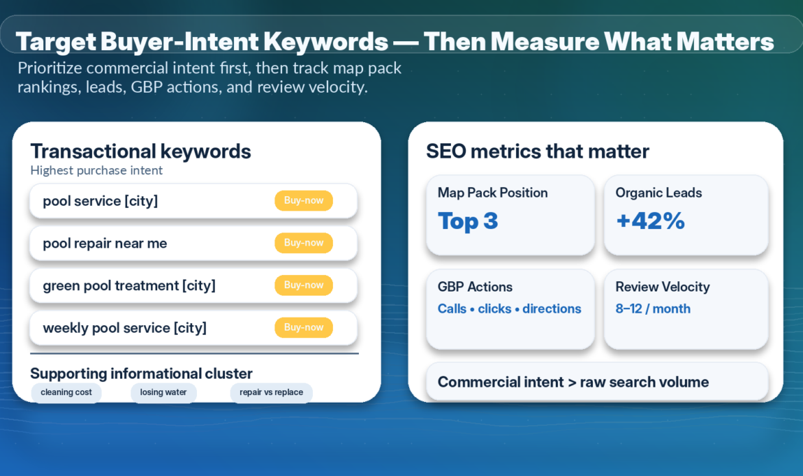 Pool company keyword strategy needs to prioritize by commercial intent, not search volume. A keyword with 5,000 monthly searches that is purely informational is less valuable to your business than a keyword with 300 monthly searches where every searcher is a homeowner actively looking to hire a pool service company today.